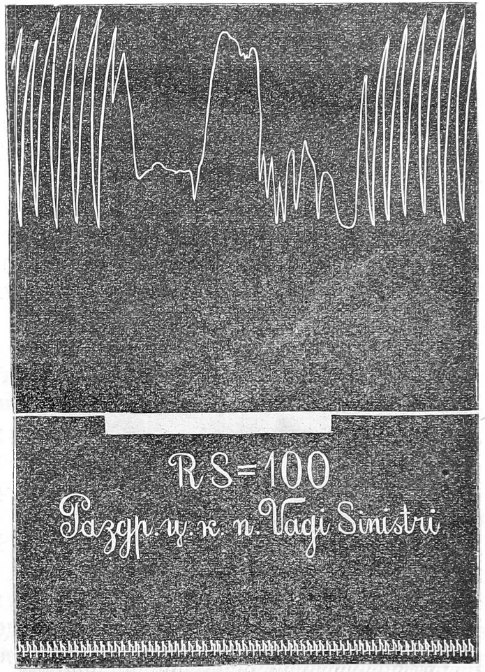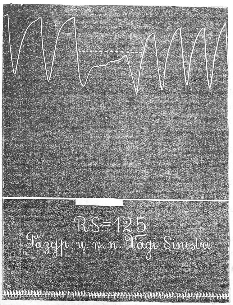 9 ч. 50'. Соединен. съ ниш. приб., бараб. пущ въ ходъ. Раздраж. ц. к. n. vagi sinis. при RS=125— какъ при предъидущемъ раздраженіи. Бараб. останов., трахеал. канюл. разъединена. Провѣтриваніе бутыли.