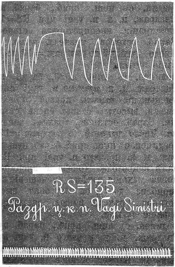11 ч. 42'. Соединен. съ пиш. приб., бараб. пущ. въ ходъ. Раздраж. ц. к. n. vagi sinis. при RS=50—какъ при предъидущемъ раздраженіи.