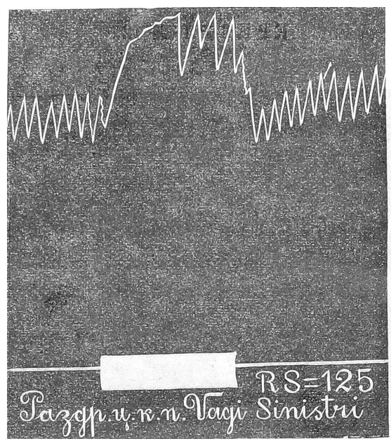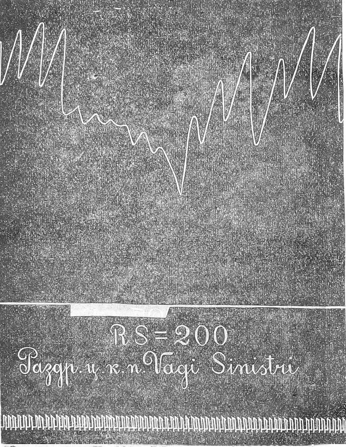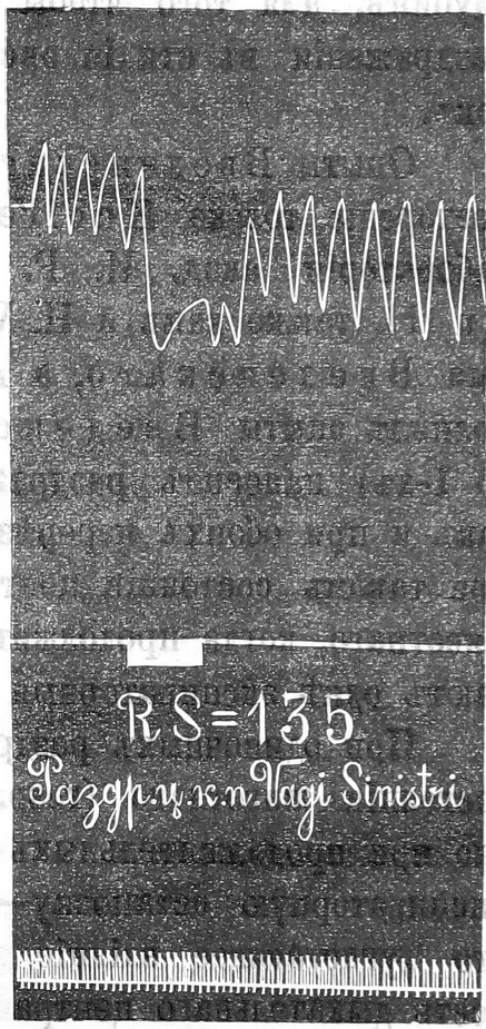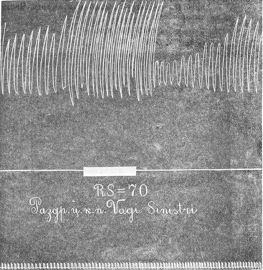 10 ч. 11'. Соединен. съ пиш. приб., бараб. пущ. въ ходъ. Раздраж. ц. к. n. vagi sinis. при RS=75—какъ при предъидущемъ раздраженіи. Бараб. останов., трахеал. канюл. разъединена.