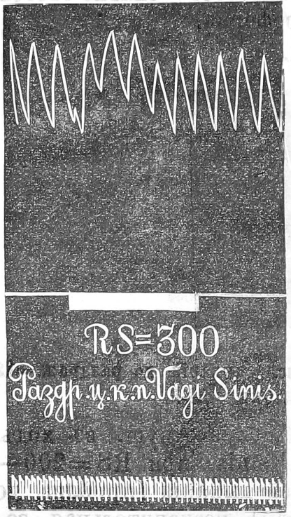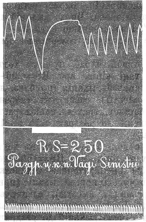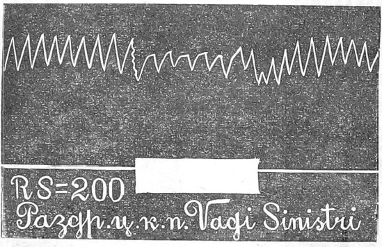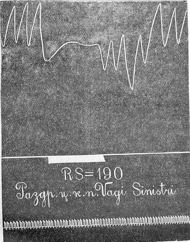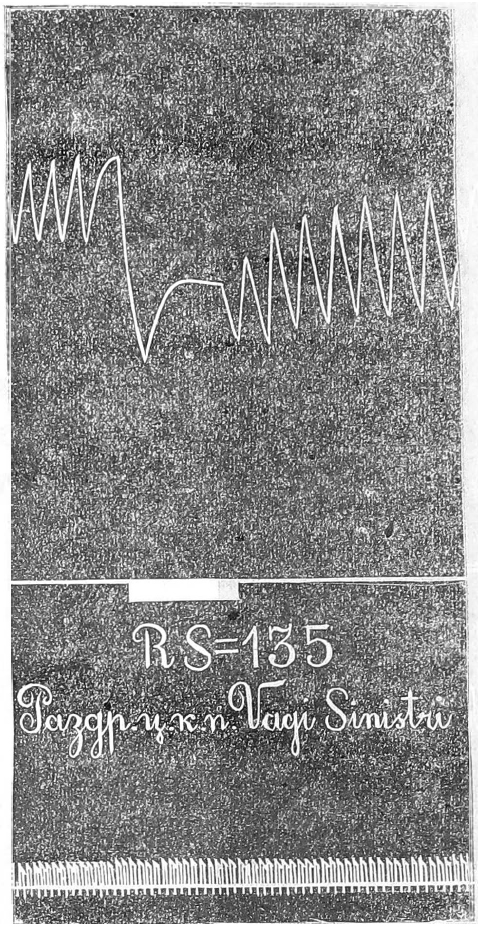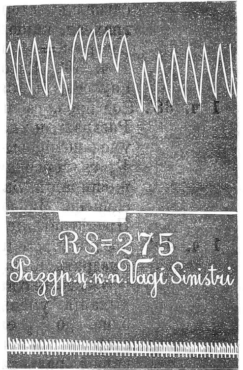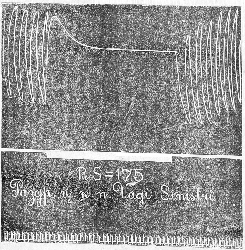 Въ 2 ч. 19'. Соединен. съ ниш. приб., бараб. пущ. въ ходъ. Раздраж. ц. к. n. vagi sinis. при RS=350—какъ при предъидущемъ раздраж. Обезкровливаніе.