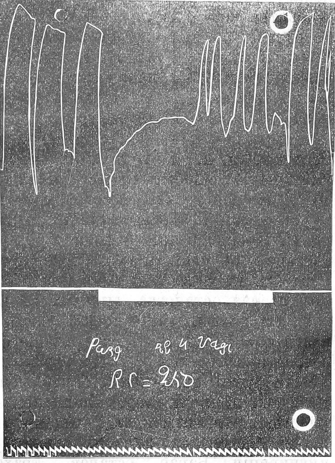 11 ч. 22'. Соединен. съ пиш. приб., бараб. пущ. въ ходъ. Раздраж. ц. к. n. vagi sinis. при RS=160—непродолжительная экспираторная остановка дыханія, прерванная инспираціей, уменьшеніе высоты кривой дыханія (приблиз. до ⅕ ея первоначал. высоты), сдвигъ кривой въ сторону экспираціи.