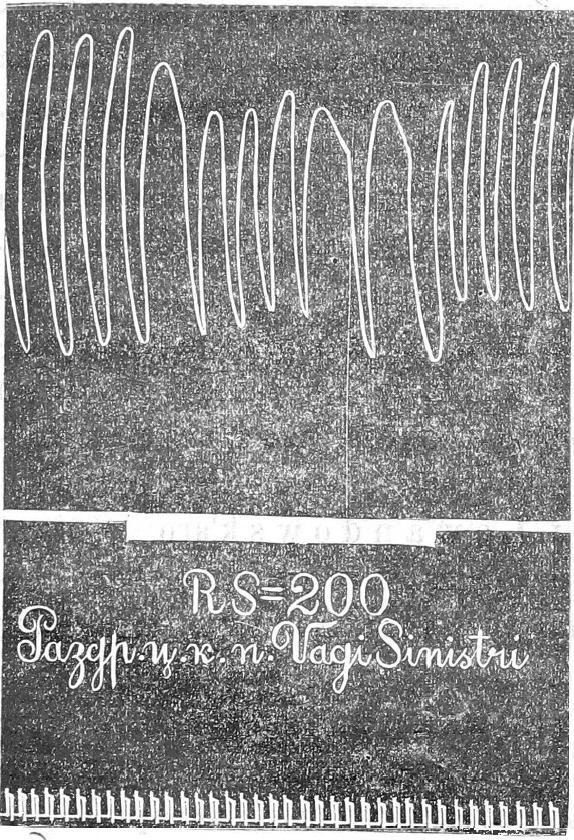 Раздраж. ц. к. n. vagi sinis. при RS=190—инспираторная остановка дыханія. Бараб. останов., трахеал. канюл. разъединена. Число дыханій до раздраж.=15 въ 1'. Провѣтриваніе бутыли. Животное просыпается.