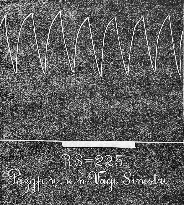 9 ч. 59'. Соединен. съ ниш. приб., бараб. пущ. въ ходъ. Раздраж. ц. к. n. vagi sinis. при RS=225—безъ вліянія.