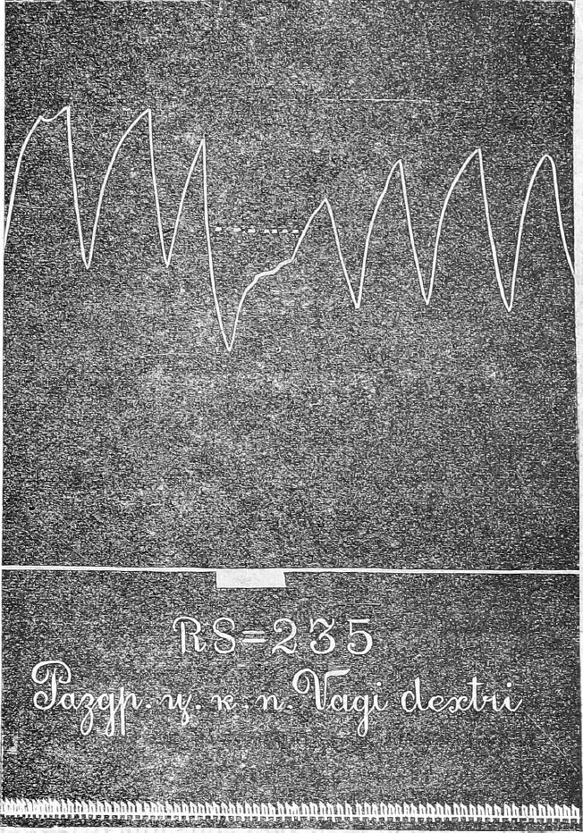 10 ч. 8'. Соединен. съ пиш. приб., бараб. пущ. въ ходъ. Раздраж. ц. к. n. vagi sinis. при RS=225— уменьшеніе высоты кривой дыханія (приблиз. на ½ ея первоначал. высоты), сдвигъ въ сторону инспираціи. Бараб. останов., трахеал. канюл. разъединена. Число дыханій до раздраж.=12 въ 1'. Провѣтриваніе бутыли.