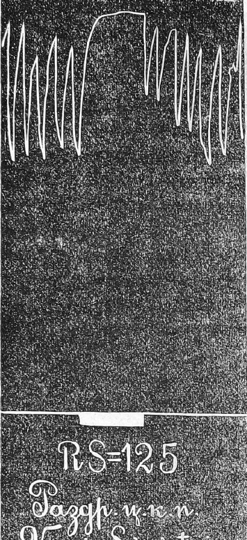 12 ч. 17'. Соединен. съ пиш. приб., бараб. пущ. въ ходъ. Раздраж. ц. к. n. vagi sin. при RS=75—безъ вліянія. Бараб. останов., трахеал. канюл. разъединена. Число дыханій до раздраж.=16 въ 1'. Провѣтриваніе бутыли.