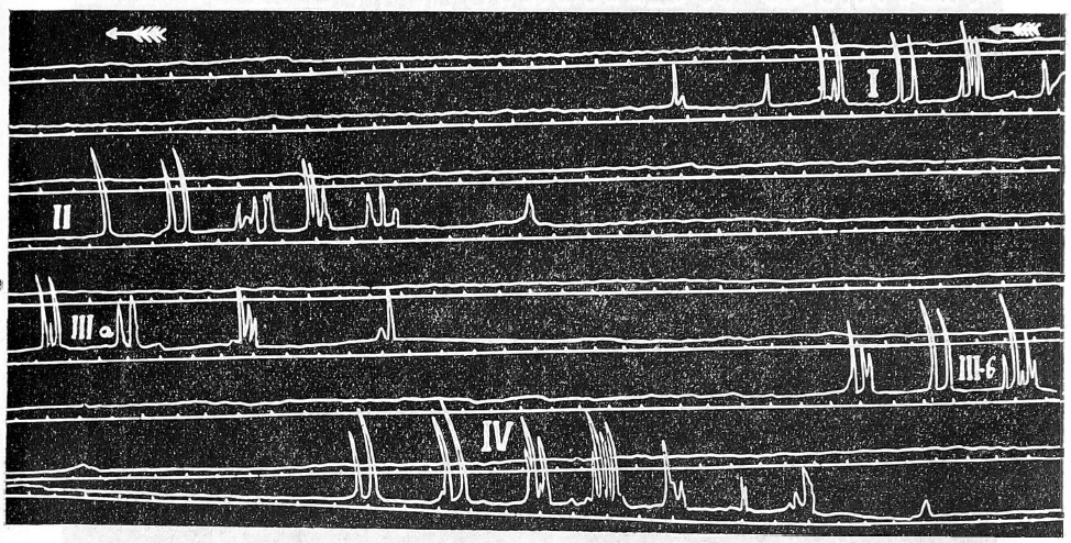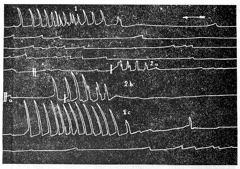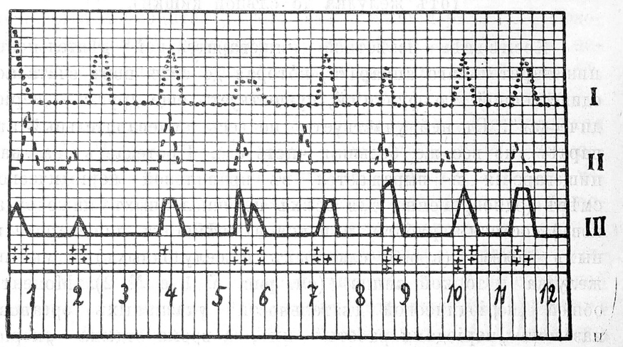 - Въ нѣкоторыхъ болѣзненныхъ случаяхъ „періодическая дѣятельность“ извращается каждый разъ извѣстнымъ образомъ. Обычно, при нормѣ, эта дѣятельность совершается однообразно и даетъ, напримѣръ, въ видѣ записи желудочныхъ движеній замѣчательно правильную, типичную кривую (см. кривую № 2).