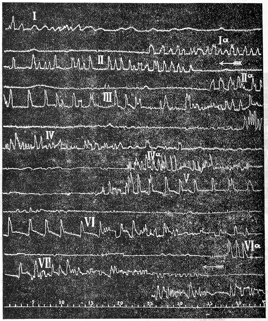 Видно 7 «періодовъ работы» (см. римскія цифры), чередующихся съ «періодами покоя». I—1-ый «періодъ работы» (его продолженіе обозначено Іа), II—2-ой «періодъ работы» и т. д. Внизу отмѣчено время въ минутахъ. Эта кривая въ общемъ совершенно сходна съ предыдущей Небольшое различіе въ деталяхъ объясняется прежде всего нѣкоторой разницей въ методикѣ полученія и въ масштабѣ кривыхъ. (Кривая получена студентомъ С. В. Аничковымъ на самомъ себѣ).
