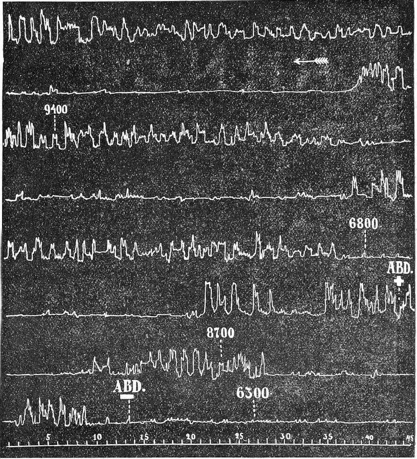Протоколъ-запись (на вращающемся барабанѣ) сокращеній пустого желудка у собаки въ теченіе около 4½ часовъ. Длина рисунка соотвѣтствуетъ ровно 35 минутамъ (каждая минута отмѣчена черточкой). Ломаныя линіи указываютъ на сокращенія желудка, прямыя—на отсутствіе ихъ.