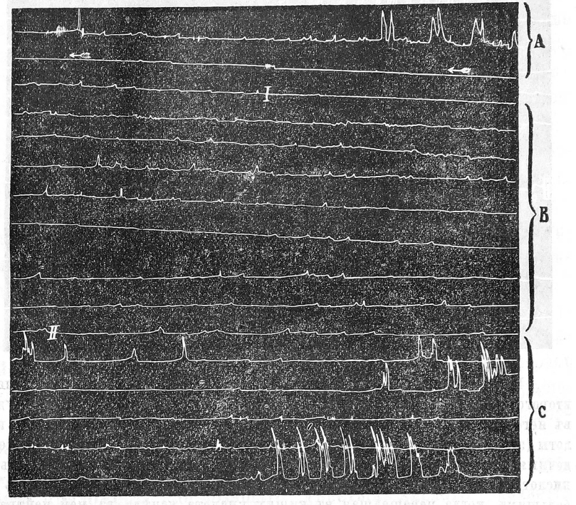 Въ опытахъ А и В скорость движенія барабана медленная—строка рисунка соотвѣтствуетъ почти 1 часу, въ опытѣ С движеніе быстрѣе—строка соотвѣтствуетъ почти 20 мин.