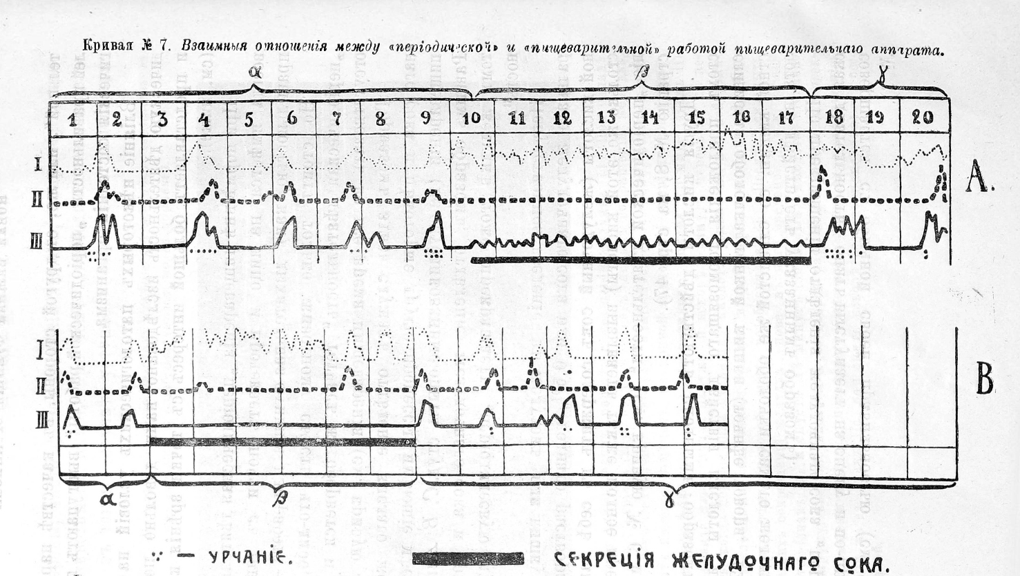 „Періодическая работа пищеварительнаго аппарата“ была открыта и подробно изслѣдована на собакахъ.