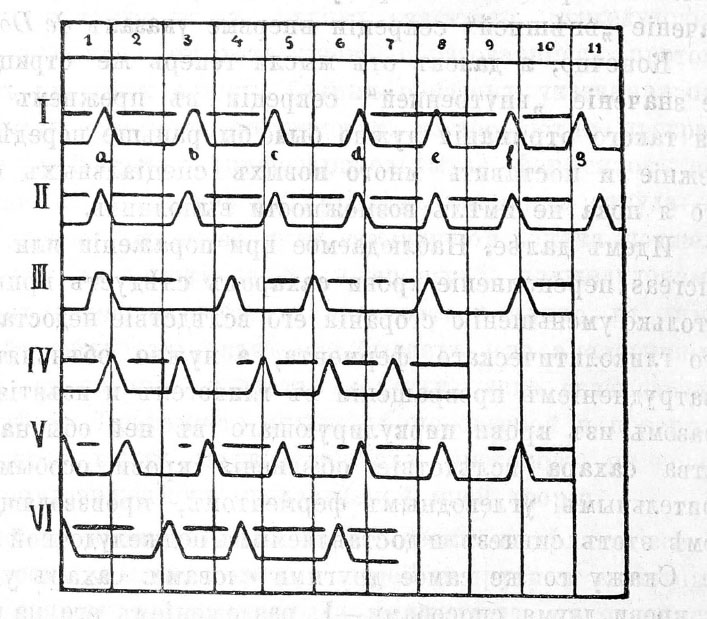 Ломаная (нижняя) линія изображаетъ «періодическую дѣятельность». Прямая прерывистая (верхняя) линія—состояніе собаки (сонъ или бодрствованіе). Пустыя мѣста (гдѣ линія прервана) верхней линіи соотвѣтствуютъ времени бодрствованія. Ясно замѣтно совпаденіе по времени между моментами пробужденія и «періодами работы». Арабскія цифры—часы наблюденія, римскія цифры—номера отдѣльныхъ опытовъ; буквами въ опытѣ I отмѣчены отдѣльные «періоды работы», ихъ было 7 (а, b, с, d, е, f, g).