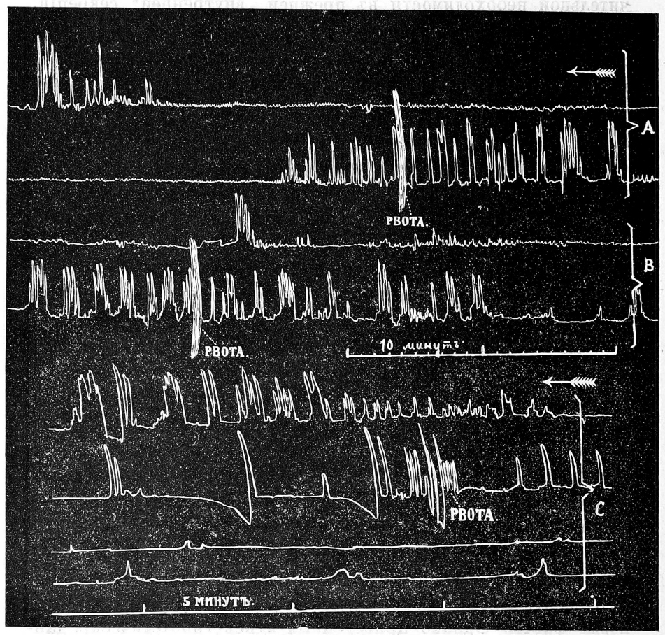 Однако не удается найти никакой другой причины для возникновенія икоты или рвоты и приходится связывать ихъ исключительно съ актомъ „періодической дѣятельности“, во время приступовъ которой онѣ только и наблюдаются. Слѣдуетъ полагать, что вспышки рвотныхъ движеній являются результатомъ простого усиленія „періодическихъ сокращеній“ желудка и кишки, что „періодическія сокращенія“ ихъ мышцъ почему-то здѣсь усиливаются и учащаются до такой степени, что превращаются въ рвотныя движенія. Такимъ образомъ обычные „періоды работы“ превращаются иногда въ приступы рвоты.