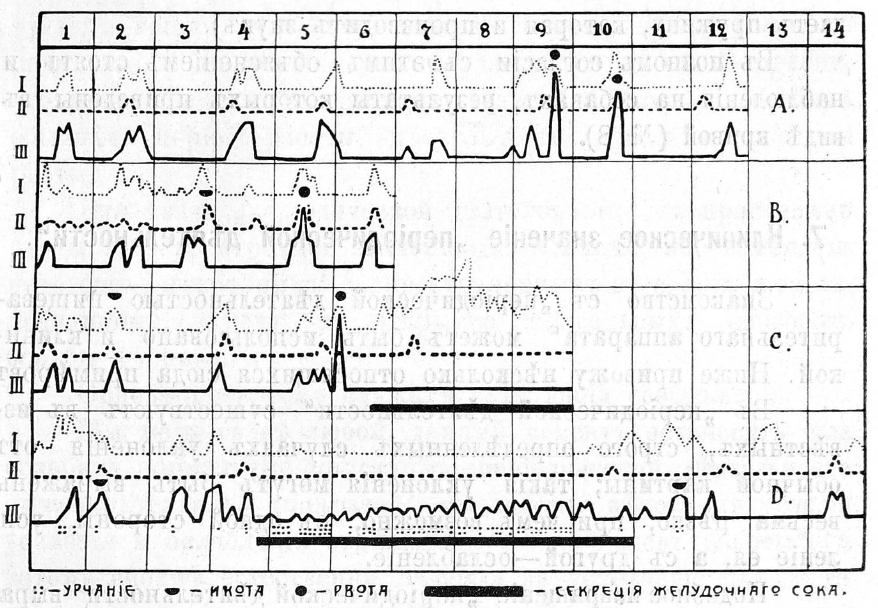 - Иногда по невыясненной причинѣ при пустыхъ желудкѣ и 12-перстной кишкѣ происходятъ періодическія икотныя или рвотныя движеніи. Эти приступы икоты и рвоты всегда совпадаютъ съ „періодами работы пищеварительнаго аппарата“ (внѣ пищеваренія) и въ теченіе даннаго дня могутъ повторяться (см. кривыя № 9 и № 10).