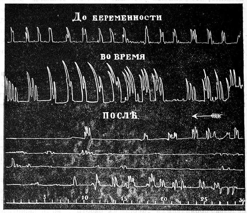 № 9. Показаны многочисленныя кривыя „періодической дѣятельности“ пустого желудка у человѣка, а также подобныя же кривыя, полученныя на сукѣ до беременности, во время нея и послѣ родовъ] 11).