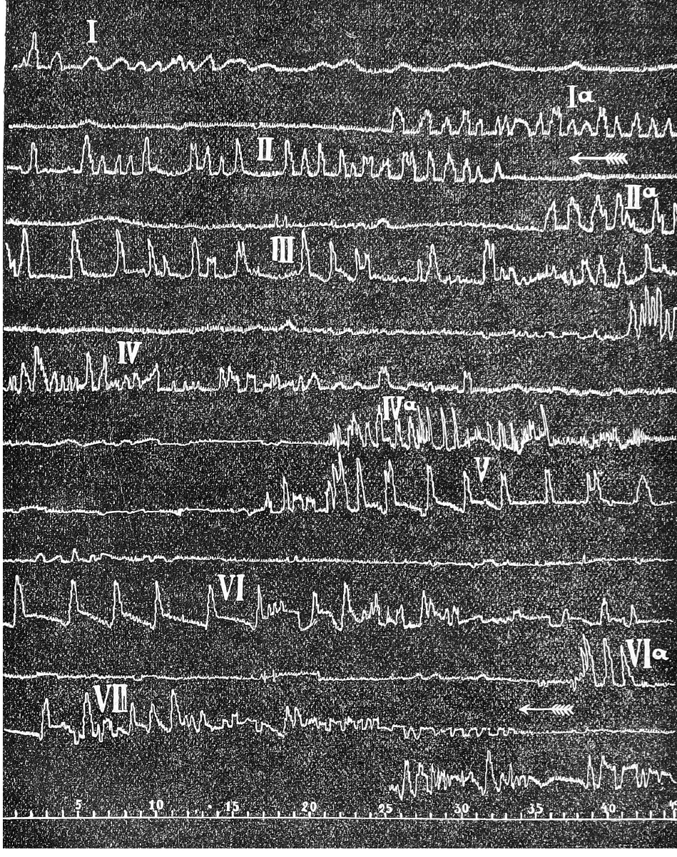 На кривой видно 7 періодовъ работы (I, II, III, IV, V, VI, VII), во время которыхъ происходили сильныя ритмическія сокращенія мышцъ желудка. Во время періодовъ покоя на кривой отмѣчались лишь дыхательныя движенія. Опытъ длился 9 ч. 46 м. Пища принята за 14 часовъ до начала опыта. Во время опыта желудокъ все время оставался пустымъ.