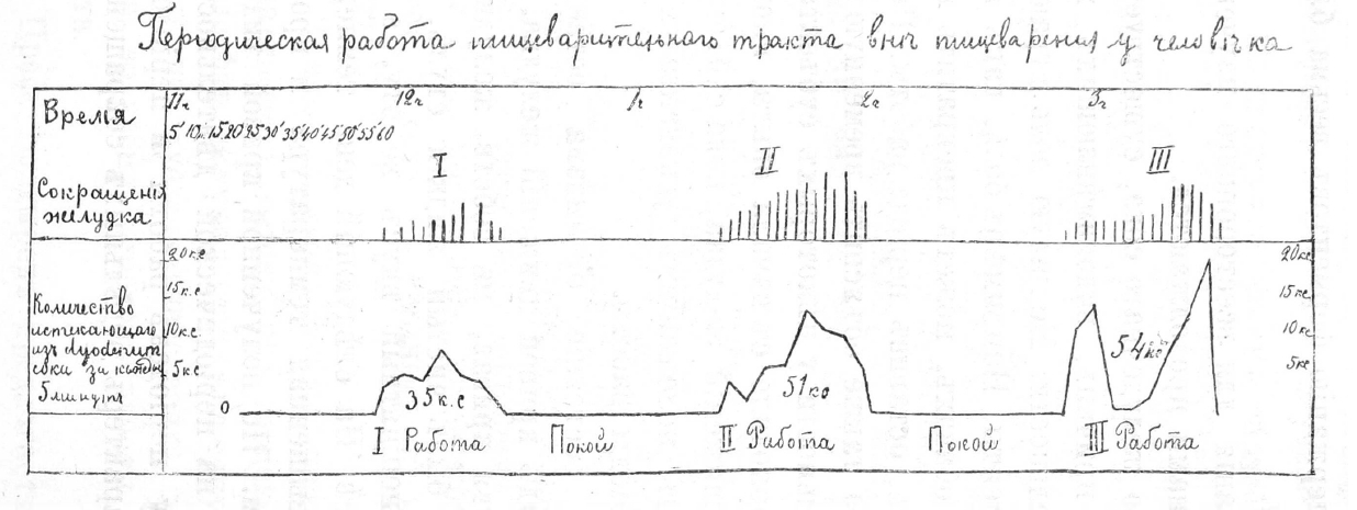 Интересъ къ экспериментамъ на человѣкѣ увеличивается значеніемъ, которое могутъ имѣть для діагностики данныя о періодической работѣ у субъектовъ съ пораженнымъ пищевымъ трактомъ.