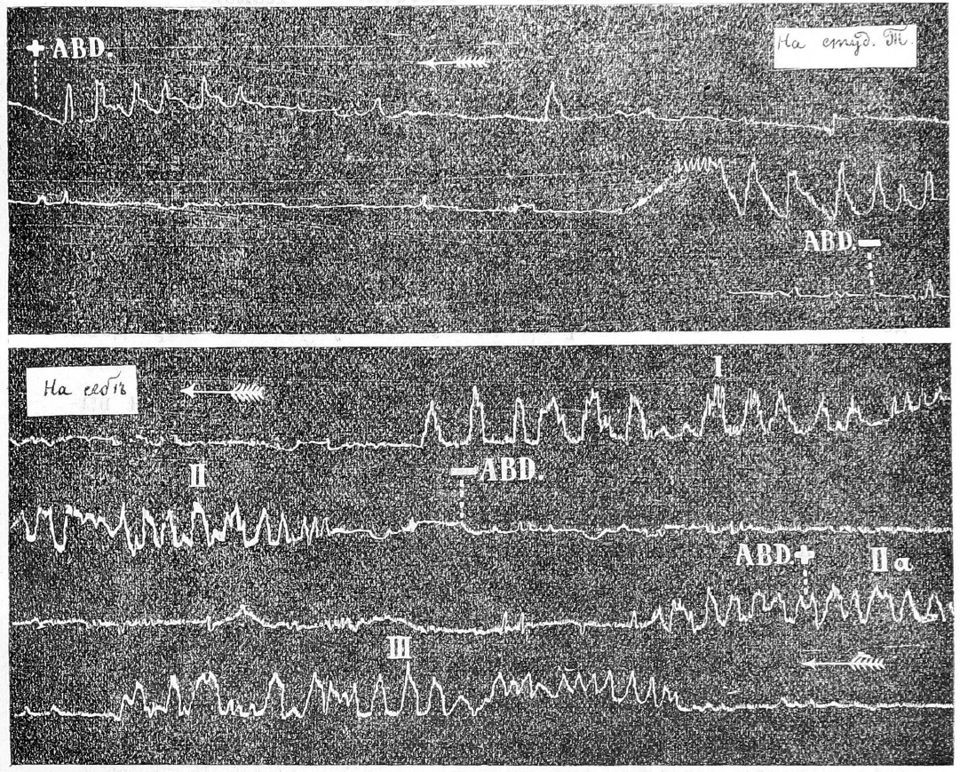 На нижней кривой полученной на собственномъ желудкѣ записаны три періода работы (I, II, III). Взяты двѣ пробы крови: первая во время покоя (Abd—), вторая во время второго періода работы (Abd+).