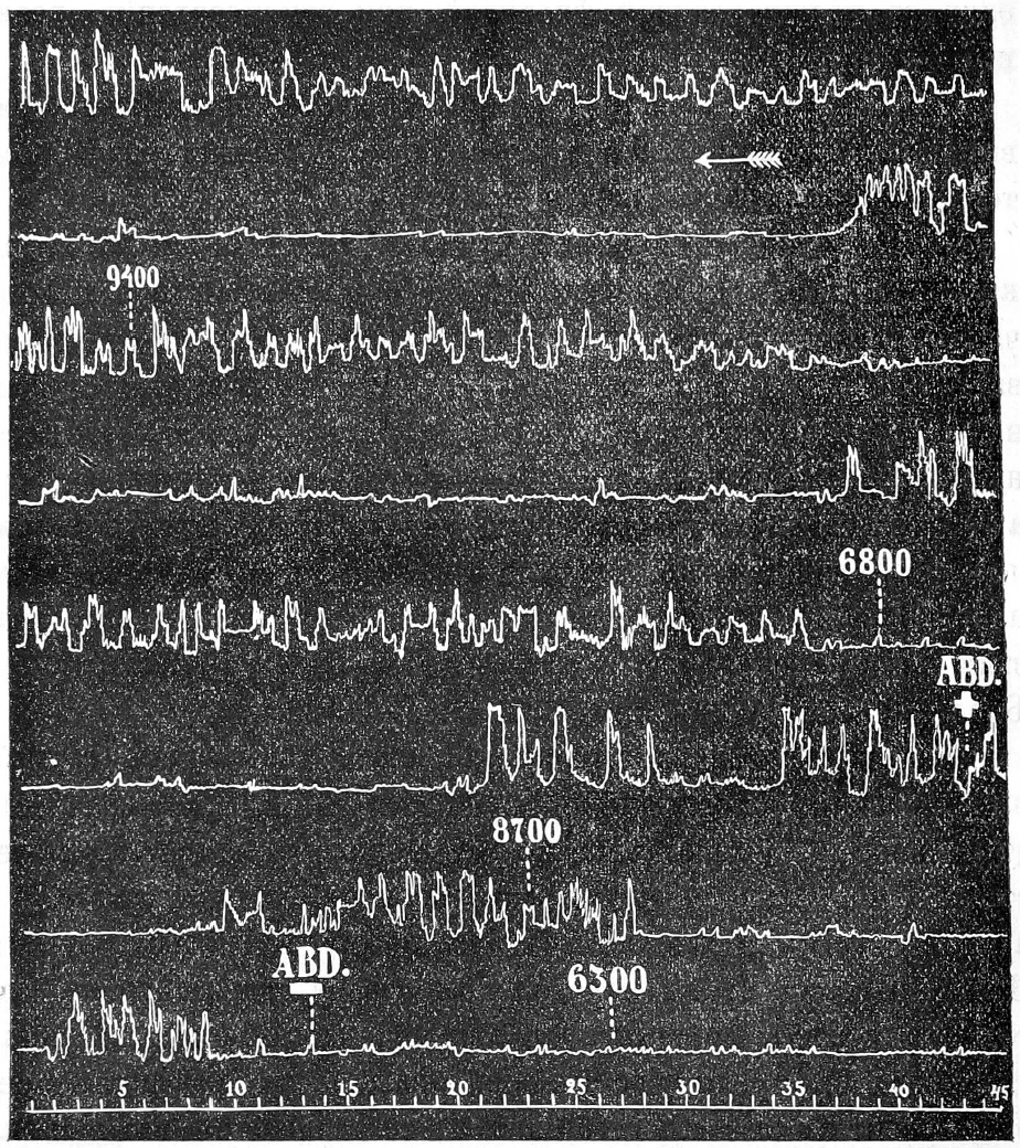 Во время третьяго періода работы взятая изъ вены кровь дала положительную реакцію Abderhalden’a (Abd+), въ періодѣ же покоя отрицательную (Abd—). Количество лейкоцитовъ во время періодовъ работы (II, IV) 9.400 и 8.700. Въ покоѣ 6800 и 6300. Опытъ длился 6 часовъ.