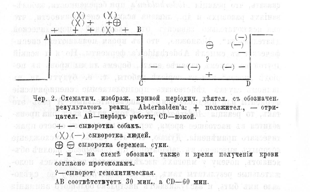 Вы видите, что какъ у собакъ, такъ и у людей реакція Abderhalden’а всегда появлялась въ періодѣ работы, и не появлялась въ періодѣ покоя. Здѣсь же вы видите (см. черт. 2), что у беременной суки (нужно замѣтить, что реакція ставилась съ человѣческой плацентой) также реакція появилась только въ періодѣ работы и оказалась отрицательной въ періодѣ покоя. Сюда еще не вошли два случая отрицательной реакціи съ сывороткой беременной суки, взятой въ отсутствіе „періодической работы“. Только одинъ разъ въ покоѣ Вы имѣете и то весьма слабую положительную реакцію [1]).