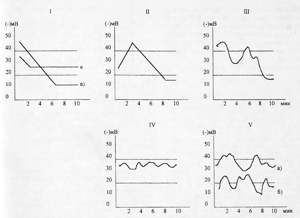 Рис. 1. Типы спонтанной динамики СМФП при эмоциональных (Iа, II) и психопатологических (III-V) расстройствах у больных с астено-вегетативным синдромом разной этиологии и у здоровых лиц в условиях длительного психоэмоционального стресса (адаптационная астения). I к - спонтанная динамика СМФП в контрольной группе в состоянии покоя (норма). По оси ординат: омега-потенциал в мВ; по оси абсцисс: время в мин. Горизонтальными линиями ограничены показатели омега-потенциала при оптимальном уровне бодрствования.