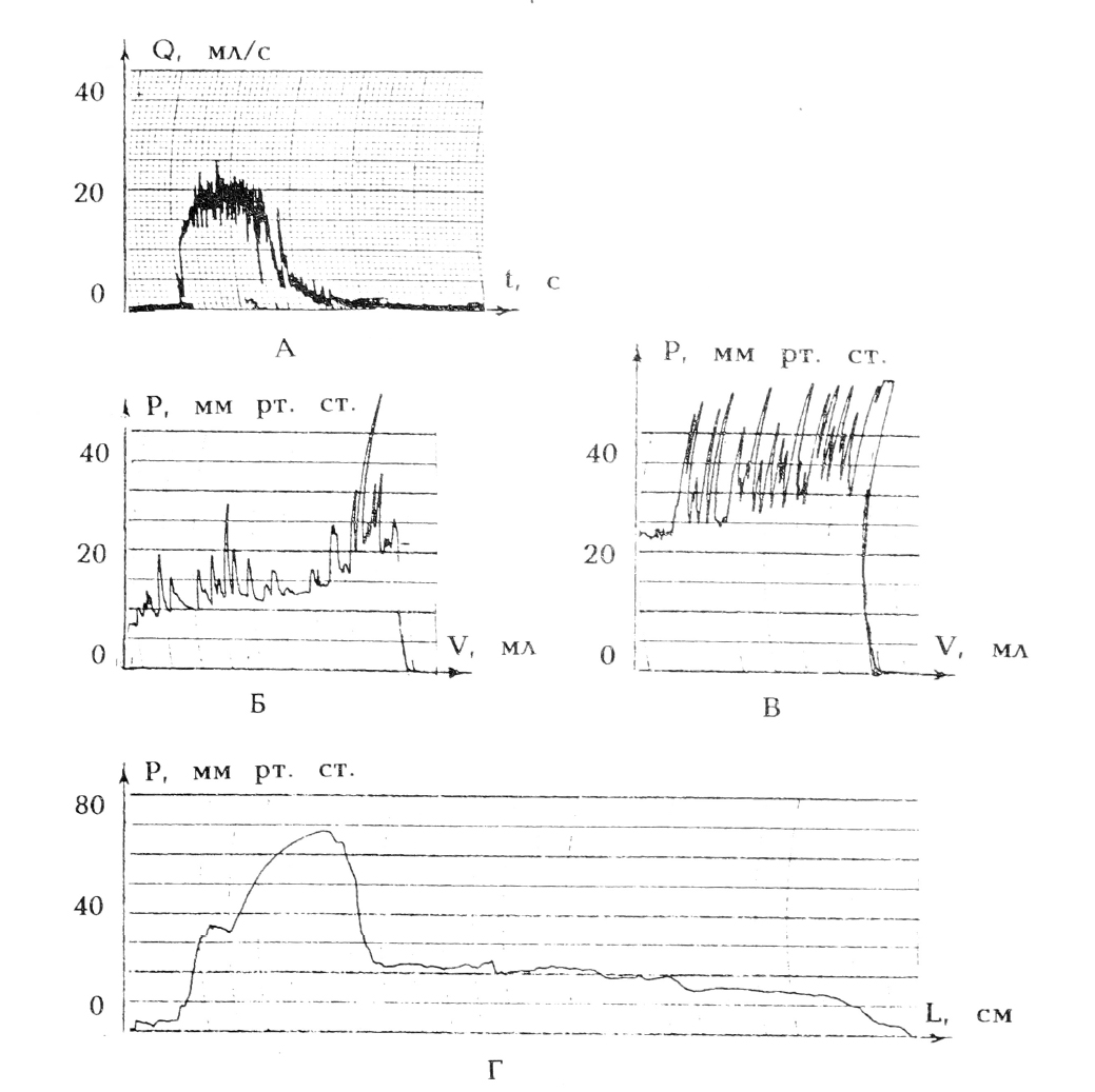 Рис. 1. Уродинамические данные больного Дениса С., 8 лет: А — урофлоутрамма; Б и В — ретроградная цистометрия в положении больного лежа (Б) и стоя (В); Г — профиль уретрального давления в положении больного лежа