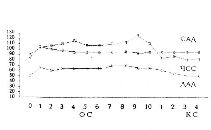 Рис. 2. Вегетативное обеспечение деятельности по данным КОП больного Дениса С., 8 лет: ОС — ортостатическое положение; КС — клиностатическое положение больного