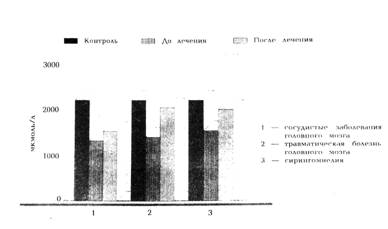 У больных сирингомиелией выявлялись гипоаминоацидемия и гипераминоацидурия. Суммарное содержание САК в сыворотке крови больных было меньше, чем в контрольной группе (соответственно 1541,5±40,6 мкмоль/л; 2 207,5±3,5 мкмоль/л; р<0,001). Определялось достоверное понижение уровня как заменимых, так и незаменимых амино кислот в сыворотке крови. После приема церебролизата отмечалось увеличение суммарного содержания аминокислот в сыворотке крови до 2 009,6±27,4 мкмоль/л (р<0,001). Концентрация заменимых амино кислот — глутаминовой кислоты, пролина, тирозина и незаменимых — треонина, валина, лейцина, фенилаланина, лизина и гистидина достоверно возросла до уровня показателей здоровых лиц (р<0,05). Суммарная экскреция свободных аминокислот с мочой достоверно уменьшилась в основ ном за счет незаменимых аминокислот (до лечения 4207,1 мкмоль/л; после лечения 2 826,7 мкмоль/л; в контрольной группе 2 538,6 мкмоль/л; р<0,001).