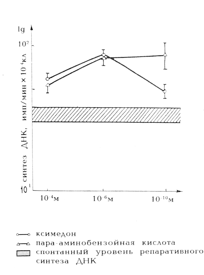 Результаты оценки влияния ксимедона и антимутагена парааминобензойной кислоты на спонтанный уровень репаративного синтеза ДНК в лимфоцитах линейных мышей представлен на рис. 1. Препараты усиливали репаративный синтез ДНК, проявляя наибольший эффект в концентрации 1()6М. Аналогичным действием обладал интерферон, который активировал репаративный синтез ДНК в лимфоцитах с ингибированной репарацией у больных с синдромом Марфана [4]. Метадон, используемый для терапии героиновой наркомании, при длительном назначении также восстанавливал репаративный синтез ДНК и нормализовал уровень хромосомных аберраций [10].