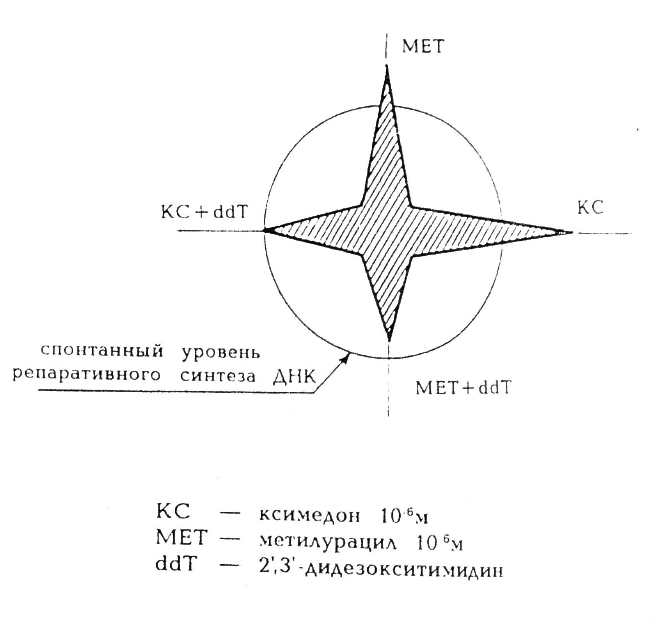 Репаративный синтез ДНК, отражающий уровень эксцизионной репарации, оценивали в соответствии с протоколом (1); включение 3Н-тимидина в ДНК лимфоцитов определяли прямым жидкостным сцинтилляционным счетом радиоактивности. В качестве селективного ингибитора ДНК полимеразы ß применяли 2',3' дидезокситимидин.