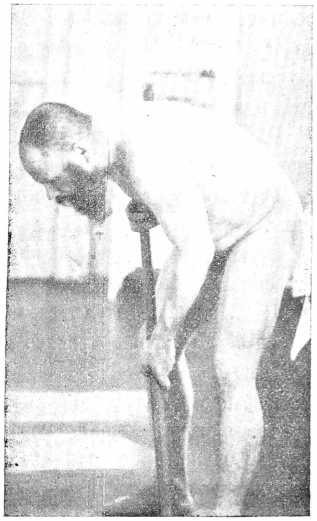 Больной имѣетъ своеобразный habitus: (см. приложенную фотографію): если онъ сидитъ, стоитъ или ходитъ, habitus одинаковъ: голова наклонена впередъ и внизъ, туловище согбенно въ формѣ рѣзкаго и большого дугообразнаго кифоза, такъ что больной весь изогнутъ впередъ и внизъ, грудная клѣтка какъ бы сдавлена спереди, ноги подогнуты во всѣхъ суставахъ; при ходьбѣ больной идетъ весь согнувшись и съ большимъ подгибаніемъ нижнихъ конечностей во всѣхъ суставахъ. Изъ такого положенія больной не выпрямляется. Однако, если его положить на спину, то туловище вполнѣ и нормально распрямляется; такое распрямленіе получается при лежаніи на спинѣ или на животѣ одинаково, т. что выясняется, что подвижность позвоночника и самъ онъ вполнѣ нормальны. Но стоитъ только больному начать переходить изъ лежачаго положенія въ любое другое, какъ согбенность вполнѣ вновь получается въ той же формѣ и той же степени.