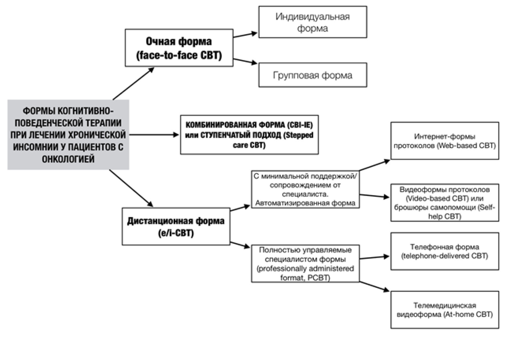 Рис. 4. Спектр форм проведения когнитивно-поведенческой психотерапии при лечении бессонницы у пациентов онкологического профиля
