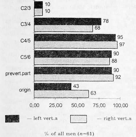 Our previous studies by ultrasound duplex scan revealed that in 88% of the cases with a carotid-stenosis of more than half the lumen on one side, atheromatosis was also present in the contralateral carotid artery. We expected a somewhat lower coincidence in the vertebral arteries [6]. This assumption was confirmed by the present ultrasound study. We decided to compare the percentage of carotid stenoses of more than 50% with all pathological findings in the vertebral arteries including non-stenotic plaques. This seems to be justified, because plaques in the vertebral arteries are not as easy to detect by ultrasound as in the carotid arteries: В mode and Doppler signals are more difficult to interpret, because the arteries lie deeper and are surrounded by bony structures; hence small plaques will not be recognized as easily in the vertebral as in the carotid arteries. Cross sections of the vertebral arteries will seldom reveal the exact degree of stenosis. Plaques of low echo density, even difficult to distinguish in the vessels close to the surface, are rare in the duplex scans of the vertebral arteries.