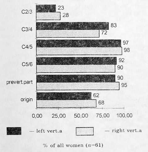 Hemodynamically important stenoses of the vertebral arteries were found only at their origins. Some plaques were also visualized in the prevertebral, few in the intertransversal parts. In most cases the degree of stenosis could not be determined, as sufficient В-mode cross-sections were not possible; estimations had to rely on the doppler-signal. For this reason all clearly visible plaques are included under the term "stenosis" in the following data.