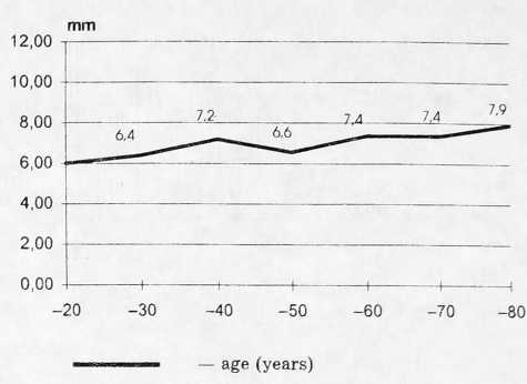 The lumina of the vertebral arteries differ more between right and left than in the carotid arteries. In about one half of 1131 patients the lumina of both vertebral arteries were identical within 0,5 mm. The left artery was dominant in 33%, the right artery in 17% of the cases. A left/right-difference of more than 1 mm in lumen was found in 33% (24% l.r., 9% r. 1.). Hypoplasias (lumen equal or less than 1,5 mm) were seen in 3,1% of the right, 1,9% of the left vertebral arteries: 3 of 1131 patients (0,3%) had hypoplasias of both vertebral arteries. The mean cumulative lumen of both vertebral arteries increased by age from 6,0 mm in patients younger than 30 years to 7,9 mm in patients older than 80 years without a significant sex difference ( + /-1,1 mm for each agegroup) (fig. 3).