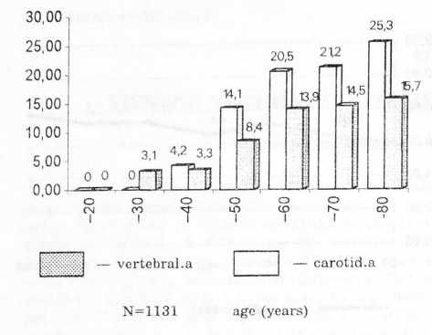 The percentage of pathological findings in the vertebral arteries increased by age from 3% in patients in their 4th decade to 16% in those over 80 years of age. In the same group of patients, carotid stenoses of more than 50% occured somewhat more frequently in most age groups (fig. 4).