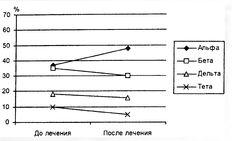 Рис. 2. Изменения ритмов ЭЭГ после лечения больных PC без использования БОС