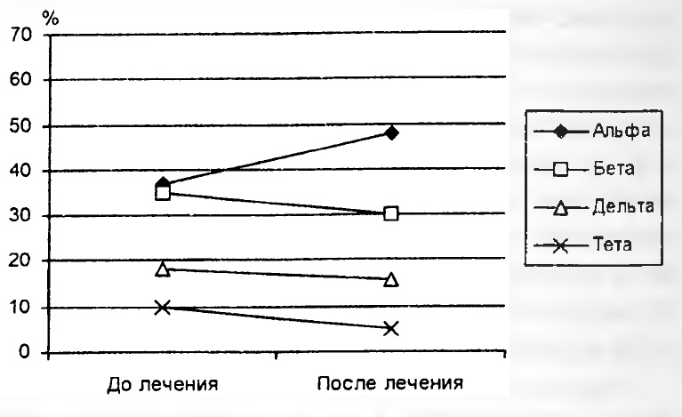 Рис. 1. Изменения ритмов ЭЭГ после лечения больных PC с использованием БОС