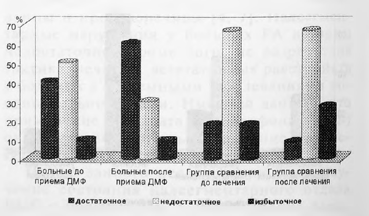 Следовательно, применение ДМФ приводило к подавлению симпатикотонии, характерной для больных РА, тогда как при обычной противовоспалительной терапии без ДМФ симпатикотония не только не снижалась, а даже имела тенденцию к нарастанию.