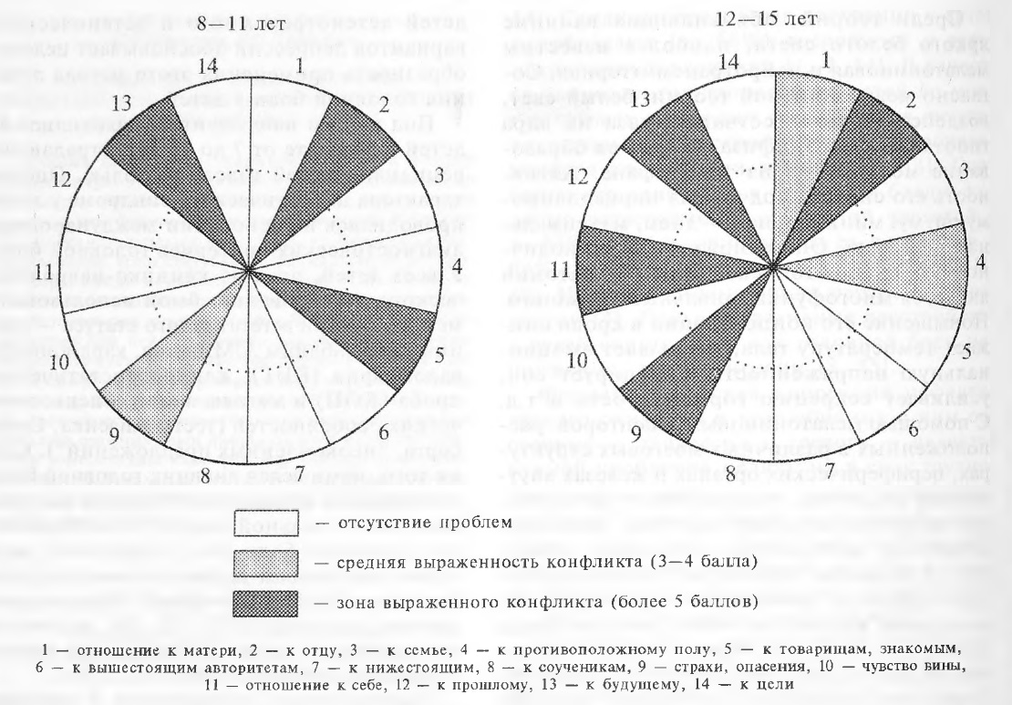 Рис. 1. Структура межличностных взаимоотношений и зоны конфликтов при ГБ в зависимости от возраста детей (по тесту “неоконченных предложений”)