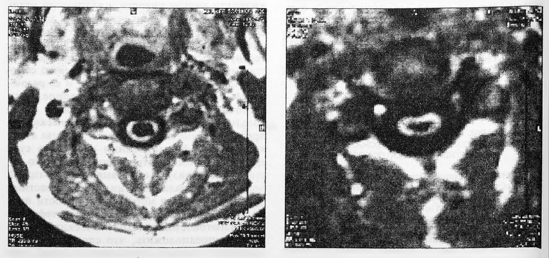 На сагиттальных МРТ картинах у всех больных были обнаружены полости различной протяженности — от 2—3 сегментов до распространения на несколько спинальных отделов. Выявленные кисты имели типичную локализацию в шейно-грудной области и располагались в регионе центрального канала. Диаметр полости в месте наибольшего расширения составлял 1—20 мм. Аксиальные срезы спинного мозга позволили установить различную форму сирингомиелических полостей. У 46 больных на аксиальных срезах полость имела округлую или овальную форму, иногда неправильную. В части случаев наблюдалось распространение полости в заднебоковые отделы спинного мозга с одной или двух сторон в виде подковы. У 26 больных была обнаружена необычная форма полости, которая имела вид узкой полоски, сплющенной в переднезаднем направлении и растянутой в стороны (рис. 1). Подобная картина аксиального среза была интерпретирована нами как исход спонтанной декомпрессии и коллапс сирингомиелической полости. Диагностика подобного коллапса основывалась не только на особой вытянутой в стороны форме полости, но и на соответствующей деформации спинного мозга с аналогичным сплющиванием его на аксиальных МРТ-срезах с расширением переднего субарахноидального пространства.