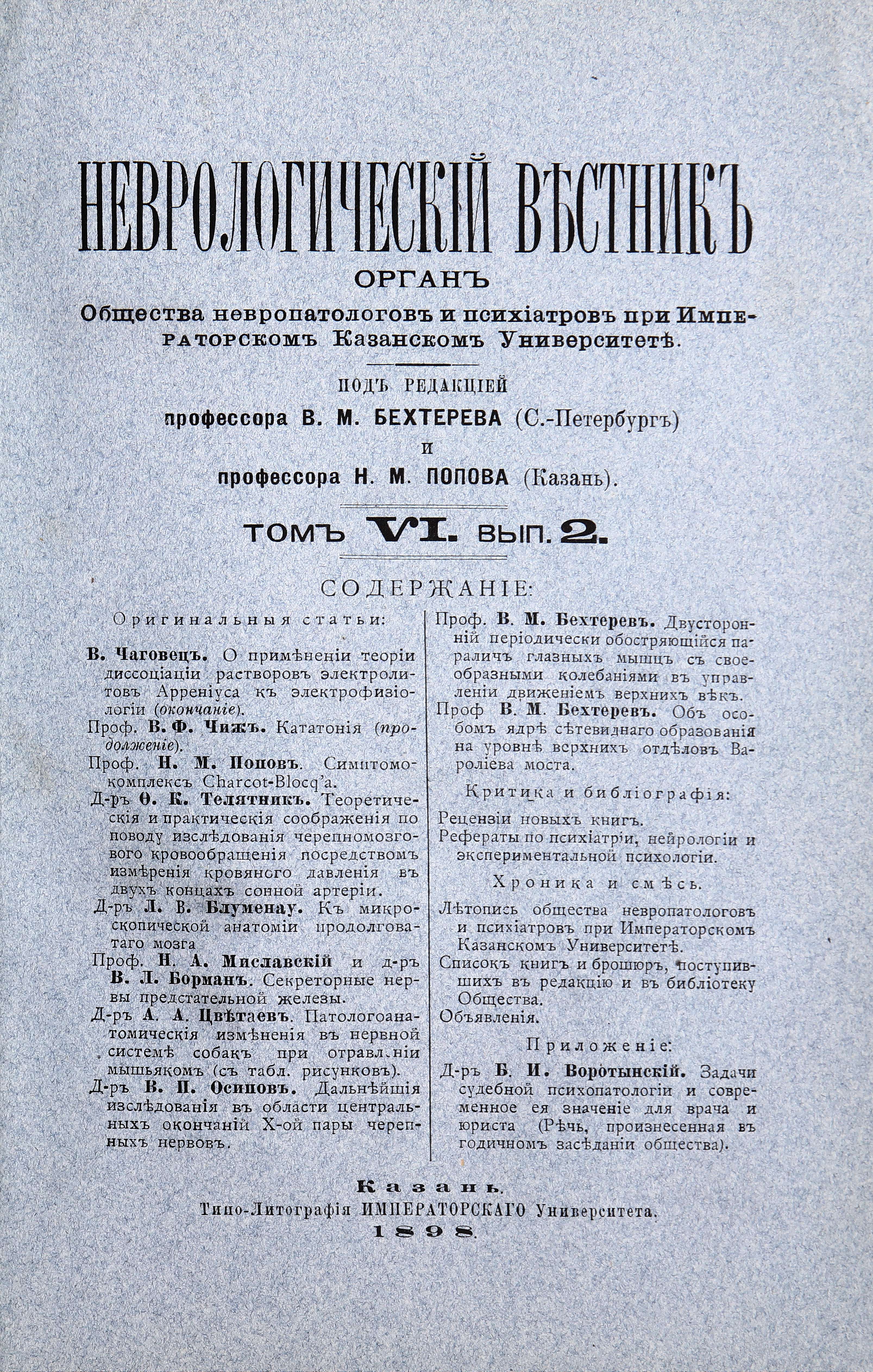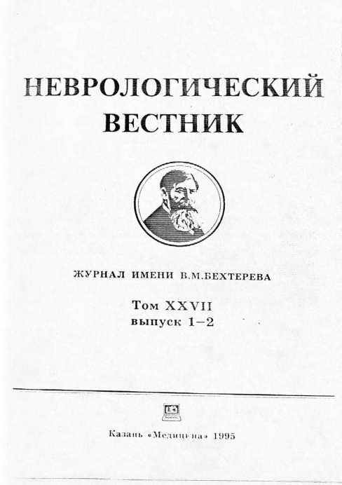 Печатным органом общества стал журнал "Неврологический вестник", издававшийся под редакцией В.М. Бехтерева с 1893 по 1918 г. С 1880-х годов по 1918 г. в России существовало 18 периодических изданий неврологической тематики, но большая часть из них выходила не более одного-пяти лет подряд. В числе самых стабильных и авторитетных были три журнала: "Обозрение психиатрии, неврологии, неврологии и экспериментальной психологии" также под редакцией Бехтерева (Петербург, 1896—1918), "Журнал невропатологии и психиатрии им. С.С.Корсакова" (Москва, 1901—1917) и казанский "Неврологический вестник"8. В 1993 г. нами был возрожден журнал "Неврологический вестник" с присвоением ему имени основателя — В.М. Бехтерева. В январе 1998 г. "Неврологическому вестнику" исполнится 105 лет.
