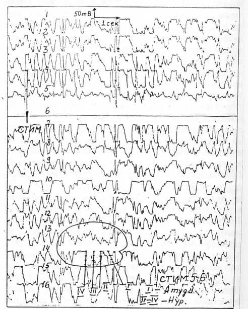Наиболее часто при одновременной регистрации СГ ЭЭГ на фоне ЭС височно-лимбических и подкорковых структур выявлялся факт распространения пароксизмального разряда из амигдалярно-гиппокампового комплекса на переднюю комиссуру и субталамические поля Фореля Н1 и Н2, в ряде случаев — на вентролатеральное ядро таламуса. Эти факты могут свидетельствовать о том, что структуры таламуса, конвергируя импульсы от подкорковых образований, в том числе миндалевидных ядер, активируют не только моторную кору и низлежащие стволовые образования, но и структуры гиппокамповой извилины.