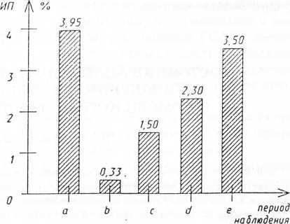 Обозначения: а — исходные данные, b — перед удалением электродов, с — после удаления электродов через один месяц, d — через 2 месяца, е — через 6 месяцев. Столбцы с крупной штриховкой — показатели 1-й группы, с мелкой — показатели 2-й группы