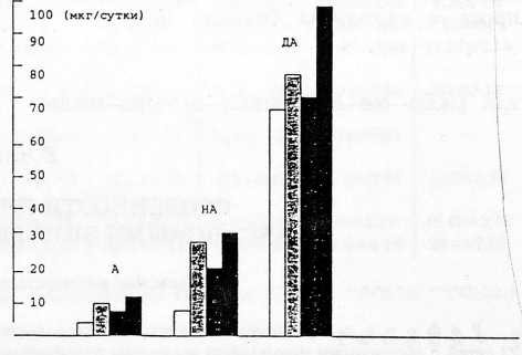 Таким образом, у всех пациентов имело место нарушение КА-обмена. Статистически достоверное увеличение выделения А, НА и ДА (Р<0,05) по сравнению с данными контроля отмечено у детей с АФС (3-я группа). Что касается пациентов с ФС (1 и 2-я группы), то у них наблюдалось статистически достоверное повышение экскреции только А (Р<0,05) и НА (Р<0,01). Динамика экскреции КА по группам приведена на рисунке.