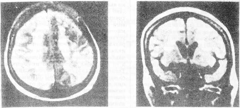 В подострой и хронической стадиях ишемического инсульта область инфаркта мозга на МРТ, как правило, была окружена по периферии зоной слабого пролонгирования времени релаксации. Ее площадь значительно варьировала у разных больных. Она не была видна на КТ, поэтому размеры очага ишемии, по данным МРТ, всегда превышали таковые, определяемые с помощью КТ.