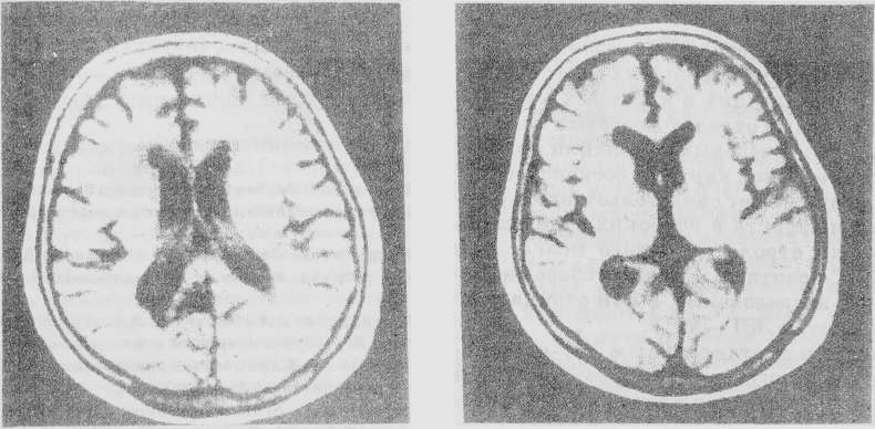 У 8 больных с ТИА КТ-картина оказалась неоднородной: у 2 были выявлены зоны пониженной плотности небольшого объема (в бассейне корковых ветвей средней мозговой артерии и в базальных ганглиях) и у одного — множественные небольшие зоны корковой атрофии, которые, по-видимому, явились следствием перенесенных ранее гипоперфузий мозга. У 5 больных очаговых изменений при КТ не обнаружено, хотя имела место диффузная атрофия мозга. Примечательно, что у больных с очаговыми изменениями на КТ клиническая продолжительность ишемической атаки составляла несколько часов и была больше, чем у больных с атрофией (от 20 минут до 1 часа).