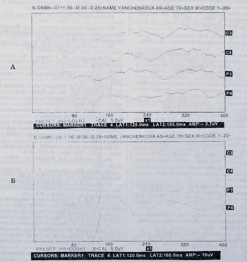 А — до начала курса лечения (1-е часы инсульта), Б — на 6-е сутки заболевания (по окончании курса семакса). Увеличение амплитуд и нормализация распределения средне- и длиннолатентных пиков, N-60, Р-100, N-150, Р-240. СЗ, С4, РЗ, Р4 — ЭЭГ отведения по системе “10—20”. По оси абсцисс — латентный период пиков в миллисекундах