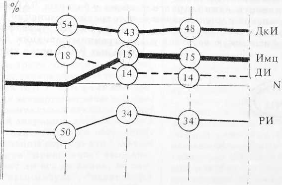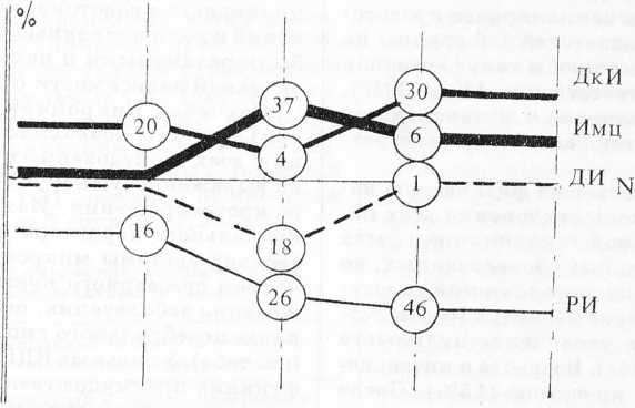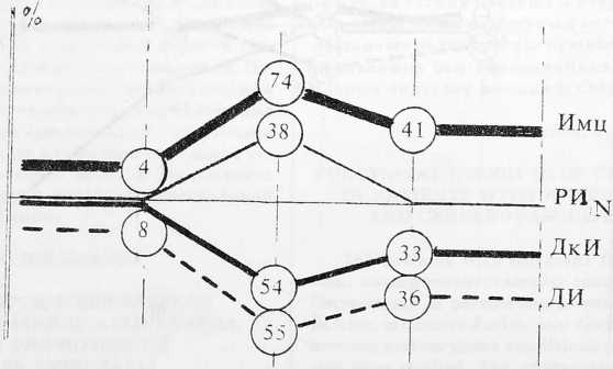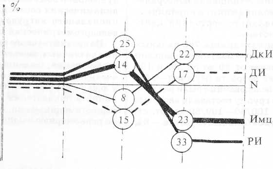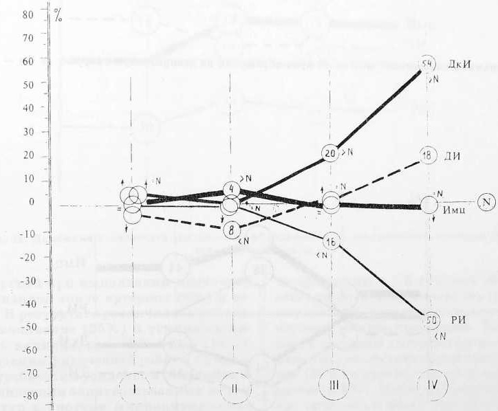 ДкИ — дикротический индекс, ДИ — диастолический индекс, Имц — индекс микроциркуляции, РИ — пульсовое кровенаполнение. I — IV — группы обследованных.