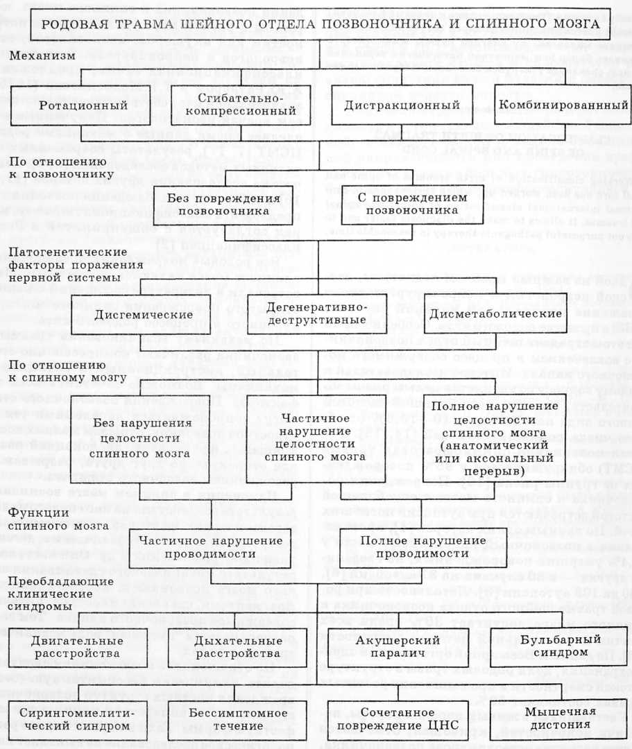 Оценка тяжести состояния новорожденного, выработка оптимального пособия, установление диагноза, определение прогноза невозможны без разработки классификации повреждения позвоночника и спинного мозга, которая бы в равной мере удовлетворяла потребностям как акушеров, неонатологов, так и неврологов и нейрохирургов. Единственная классификационная схема, предложенная А.Ю.Ратнером и Т.Г.Молотиловой (1975), в значительной мере соответствует только запросам врачей-неонатологов. Полученные в последнее время данные о механизме родовой ПСМТ [7, 17], результаты современных объективных методов обследования [5, 9], клинические исследования других авторов [11, 12, 16] и собственные наблюдения позволили нам предложить классификационную схему, которая согласуется с общепринятой в России классификацией [2].