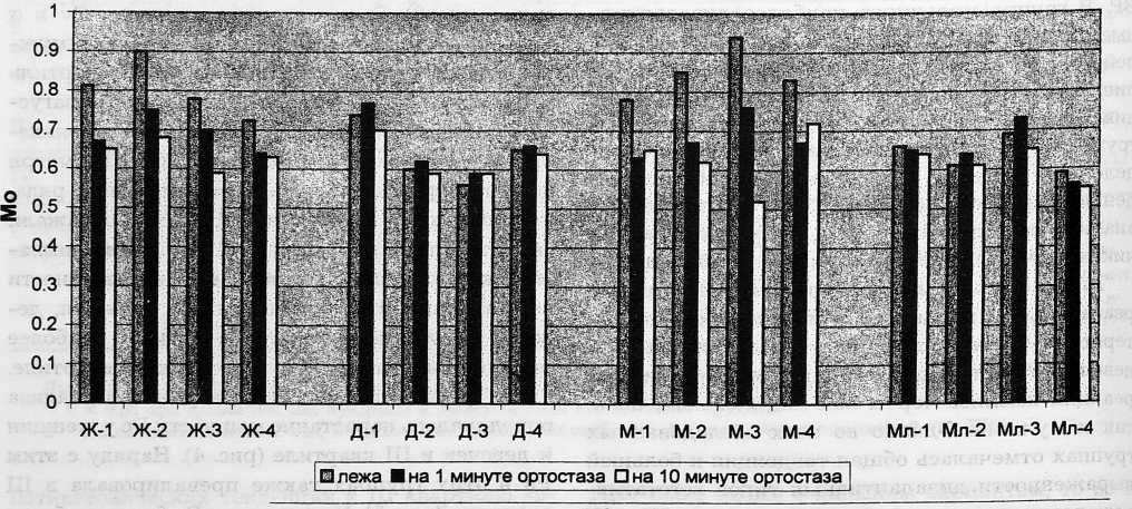 Данные вариационного ряда и частотного спектра ВРС свидетельствуют о своеобразной поквартальной динамике показателей. У всех обследованных в покое, за исключением мужчин, определялась тенденция к снижению М и Мо к III или IV квартилю (рис. 1). У девочек выявлялось некоторое увеличение этих показателей в IV квартиле, у мальчиков - в III квартиле.